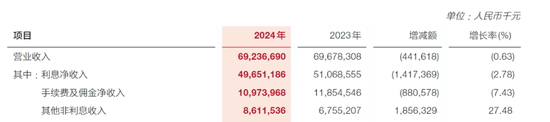 从营收的三个主要构成项目来看,广发银行利息净收入496.51亿元,营收占比超过70%,较2023年下降2.78%;手续费及佣金净收入109.74亿元,较2023年下降7.43%;其他非利息收入86.12亿元,同比增长27.48%。