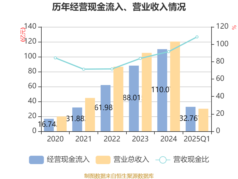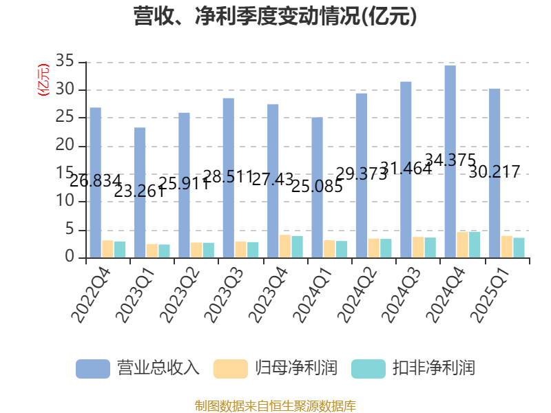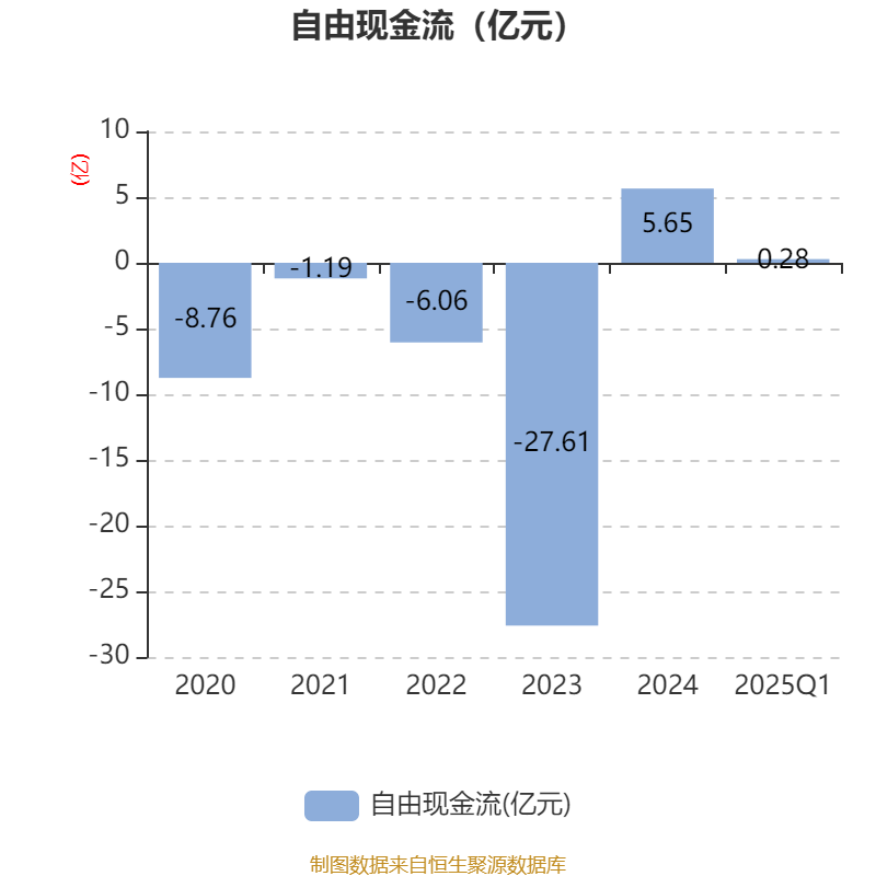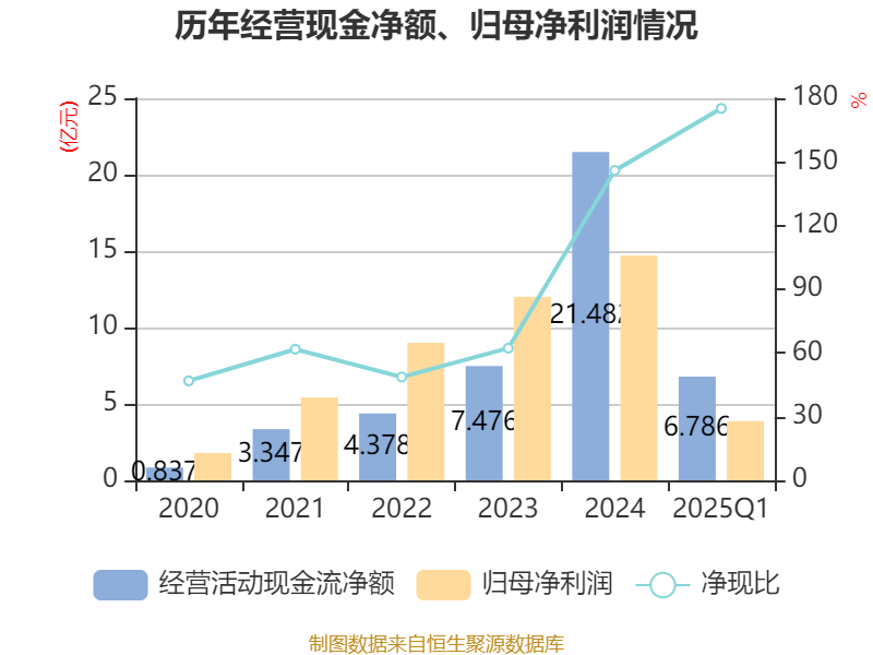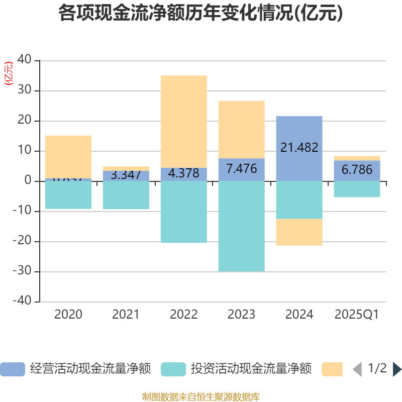 截至2025年一季度末,公司经营活动现金流净额为6.79亿元,同比增长198.89%;筹资活动现金流净额1.46亿元,同比增加3.99亿元;投资活动现金流净额-5.38亿元,上年同期为-2.78亿元。