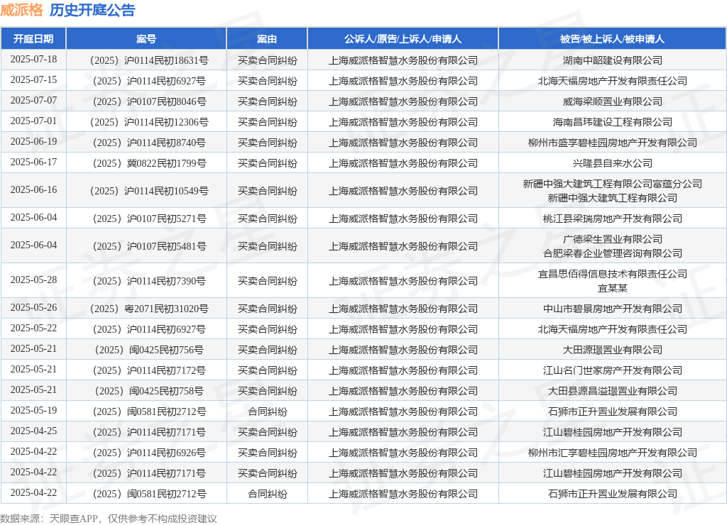 案号:(2025)冀0822民初1799号审理法院:兴隆县人民法院案由:买卖合同纠纷当事人信息: 原告/上诉人:上海威派格智慧水务股份有限公司 被告/被上诉人:兴隆县自来水公司开庭日期:2025年6月17日根据统计,近一年内以上海威派格智慧水务股份有限公司为当事人的历史开庭公告有80则,其中案由为“买卖合同纠纷”的公告以53则居首,其次为“劳动合同纠纷”有6则,“合同纠纷”有6则。历史开庭公告(前20条)如下: